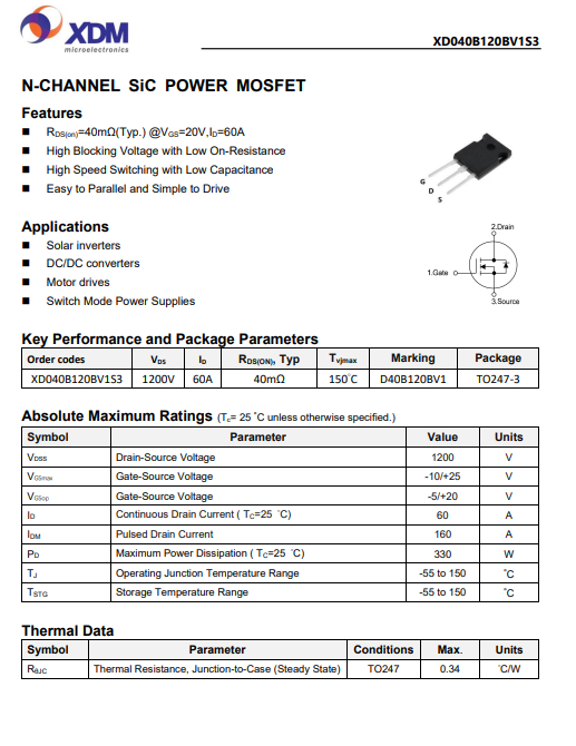 XD040B120BV1S3 40mohm 1200V TO-247 3L 電源(UPS/移動儲能/光伏逆變)