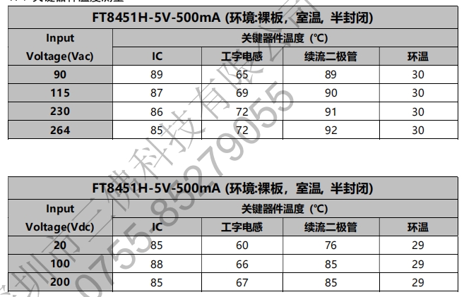 效率與電壓穩定性:在不同輸入電壓下,FT8451H均能保持較高的效率和穩定的輸出電壓。例如,在90Vac輸入時,滿載效率為65%,輸出電壓穩定在5V左右;在230Vac輸入時,滿載效率同樣達到65%,輸出電壓也保持穩定。