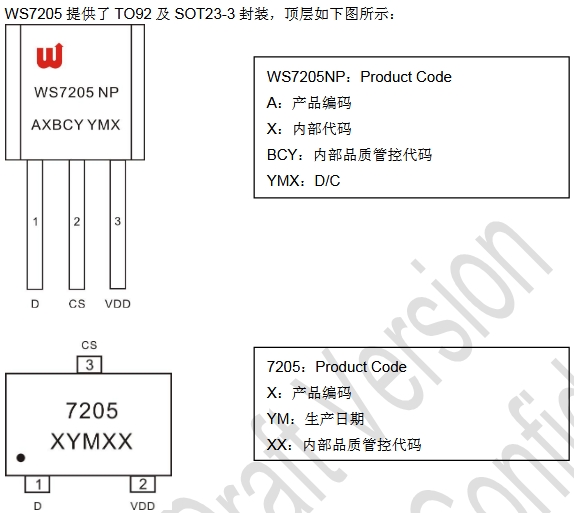 器件標識方面,WS7205NP為產品代碼,其中:
