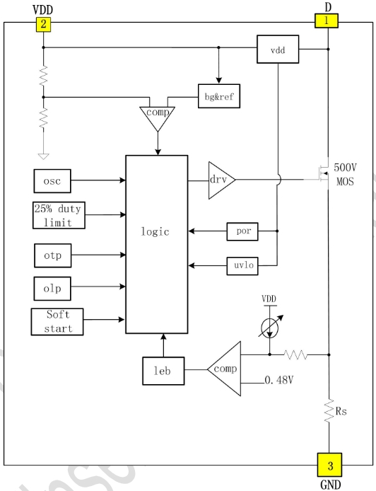 從框圖中可以看出,WS7205集成了高壓MOSFET、PWM控制器、電流采樣與保護電路、振蕩器與頻率抖動電路、軟啟動電路、過溫保護電路以及自動重啟電路等多個功能模塊。這些模塊協(xié)同工作,確保了芯片在各種工況下的高效、穩(wěn)定運行。