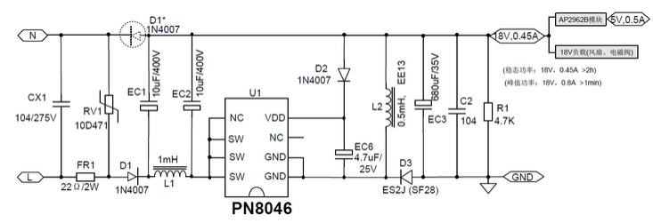 PN8046芯片的典型應(yīng)用包括18V/0.45A智能家電電源方案。該方案基于雙路18和5V,輸出非隔離開關(guān)電源,使用Chipown設(shè)計研發(fā)的離線式集成電源控制芯片PN8046。輸入電壓范圍為90~265V,輸出功率≤8.1W,輸出電壓為18V,輸出電流為0.45A,效率高達(dá)78%。