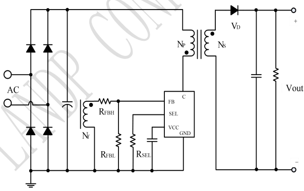 峰值電流設置通過SEL腳外接電阻RSEL實現,可調最大峰值電流IPKMAX。恒流控制和輸出恒流電流設置通過檢測電感的峰值電流實現,當原邊電感中的實時電流大于芯片設定的最大峰值電流IPKMAX時,功率管關斷。輸出電流IOUT與變壓器的匝數比、峰值電流和退磁時間等因素有關。