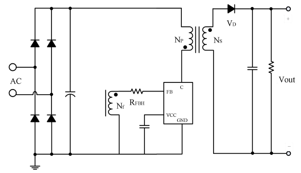該系列芯片內(nèi)置啟動電路,無需外圍啟動電阻,同時內(nèi)置FB下偏電阻,固定峰值電流來實現(xiàn)取消限流電阻,并采用自供電方式取消輔助繞組VCC供電二極管,極大地簡化了系統(tǒng)成本。