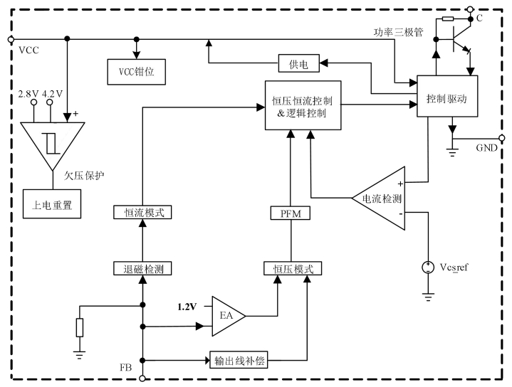 3667系列芯片的內(nèi)部框架圖揭示了其高度集成的設(shè)計理念。如圖3所示,芯片內(nèi)部集成了功率三極管、VCC供電電路、恒壓恒流控制邏輯、欠壓保護、電流檢測、上電重置、退磁檢測等功能模塊。這種高度集成的設(shè)計不僅減少了外圍元件的數(shù)量,還提高了系統(tǒng)的可靠性和穩(wěn)定性。