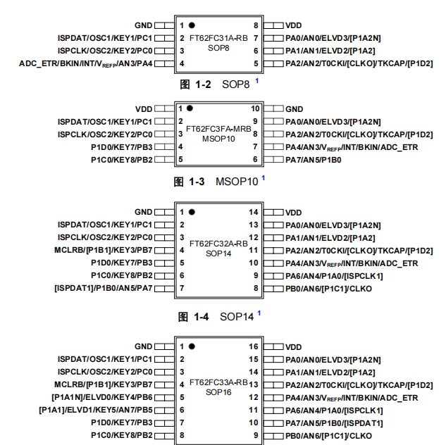FT62FC6X系列微控制器根據(jù)不同的封裝類(lèi)型和功能需求,提供了多種引腳配置。以下是結(jié)構(gòu)框圖及一些常見(jiàn)的引腳及其功能介紹: