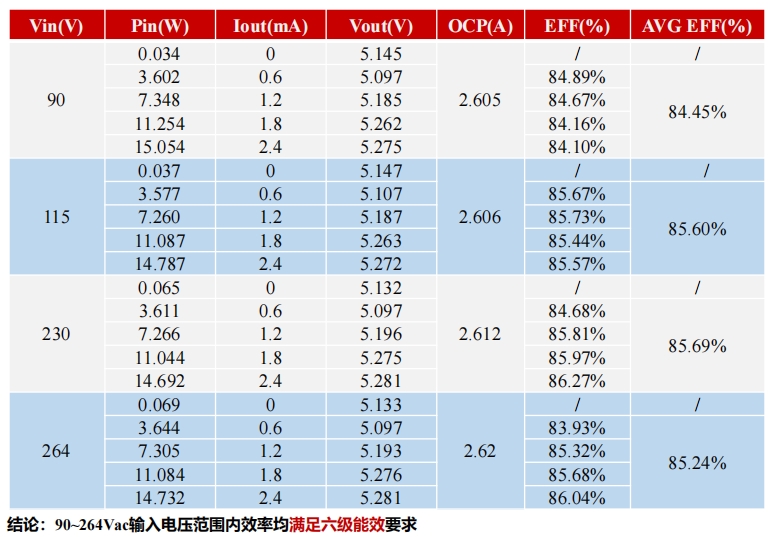 在90Vac至264Vac的輸入電壓范圍內(nèi),S7134B芯片的效率均滿足六級能效要求。具體數(shù)據(jù)如下表所示: