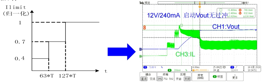 BP2522D具備軟啟動功能,通過分段增加峰值電流來減小開關應力,避免輸出電壓過沖現象。軟啟動分為三個階段:第一階段Ipk1=0.4Ilimit,第二階段Ipk2=0.7Ilimit,第三階段Ipk3等于設置的Ilimit。在重載下啟動時,系統會觸發降頻模式,工作頻率降為滿載的1/4。