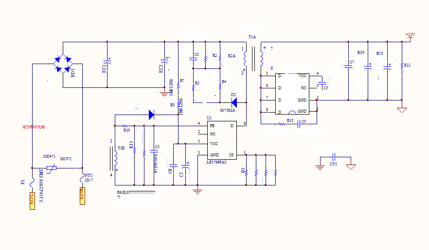 下圖展示了一個典型的12V3A電源PSR方案,使用LP3799FAC芯片作為核心組件。