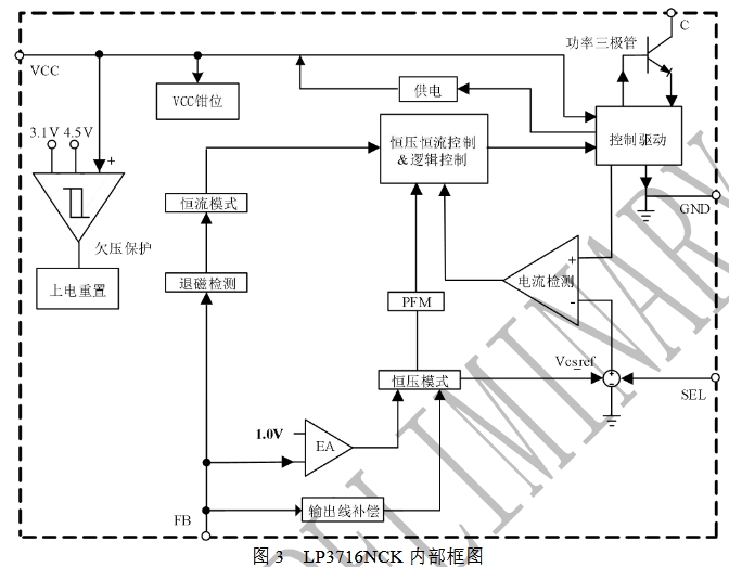 其中,SEL管腳的功能尤為關(guān)鍵,它通過與GND或VCC的不同連接方式,決定了芯片的內(nèi)置峰值電流閾值。當(dāng)SEL接GND時(shí),內(nèi)置峰值電流閾值為620mA;而當(dāng)SEL接VCC時(shí),內(nèi)置峰值電流閾值則為760mA。這種靈活的電流閾值設(shè)置方式,使得LP3716NCK能夠適應(yīng)不同功率需求的應(yīng)用場(chǎng)景。