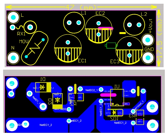尺寸:47mm×17.5mm,單面板,適合直插THT+貼片混裝,可直接塞進(jìn)86盒、小夜燈、充電底座。