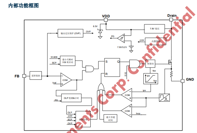 KP3114 集成有完備的帶自恢復功能的保護功能: VDD 欠壓保護、逐周期電流限制、輸出過壓保護、過熱保護、過載保護和 VDD 過壓保護等。