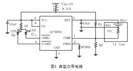 充電電壓被固定在4.2V,充電電流可通過外部電阻設(shè)置。當(dāng)充電電流在達(dá)到最終浮充電壓之后降至設(shè)定值 1/10 時,AP5056 將自動終止充電循環(huán)。當(dāng)輸入端(適配器或USB電源)拔掉后,AP5056自動進(jìn)入低電流狀態(tài),電池漏電流將降到2μA以下。AP5056還可被設(shè)置于停機(jī)狀態(tài),使電源電流降到50μA。其余特性包括:電池溫度監(jiān)測,欠壓鎖閉,自動再充電和兩個狀態(tài)引腳以顯示充電和充電終止。