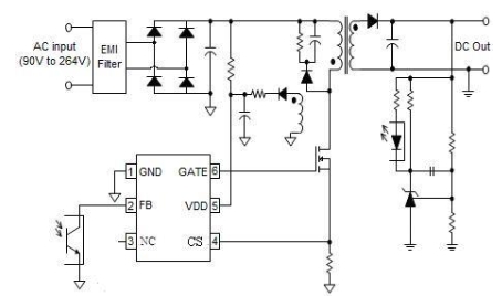 芯片通過對輸出采樣并反饋到光耦獲得高精度的恒壓輸出。內置的斜串補償電路確保了峰值電流??刂频姆€定性。內部集成的頻率抖動功能可以改善EMC.降低EMI濾波成本。
