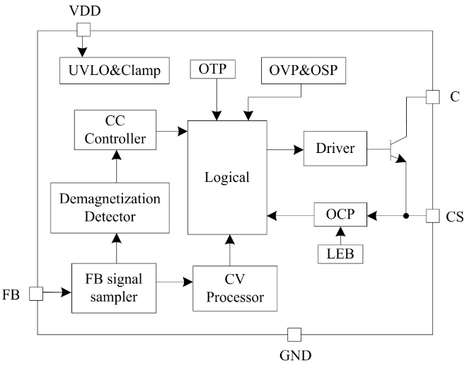 PL3376C是一款原邊控制,用于反激式開關電源的恒流/恒壓調節器。其高度集成了功率開關,并通過去除光耦以及次級控制電路,在簡化充電器/適配器等傳統的恒流/恒壓設計的同時實現了精確的電流和電壓調節,內部框架圖如下所示。