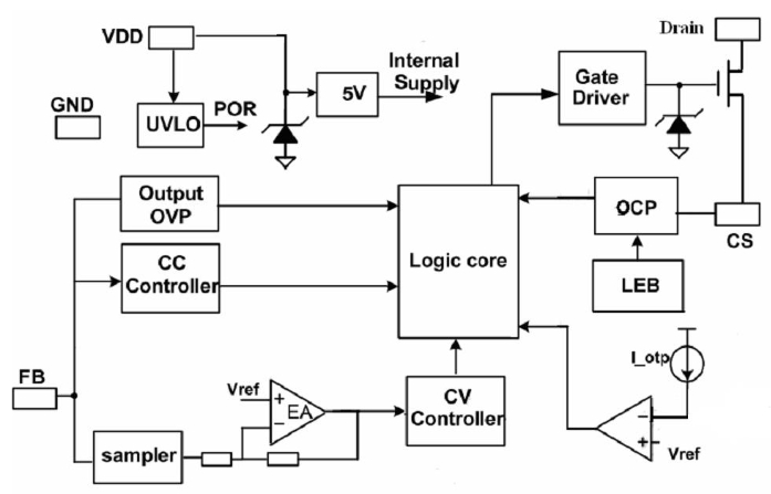 PL3326CS 是一系列高效率、高集成度、原邊調節的 PWM功率開關,其主要應用于小于 15W 的 AC/DC 反激式開關電源。PL3326C 通過去除光耦以及次級控制電路,簡化了充電器/適配器等傳統的恒流/恒壓的設計,從而實現高精度的電壓和電流調節,內部框架圖如下所示