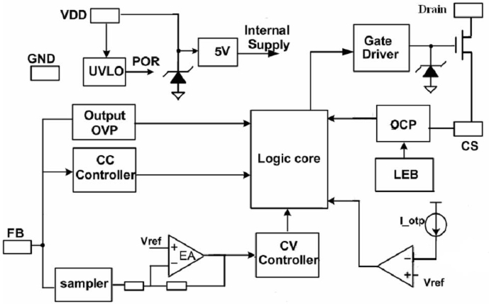 PL3329CD 是一系列高效率、高集成度、原邊調(diào)節(jié)的 PWM功率開(kāi)關(guān),其主要應(yīng)用于 AC/DC 反激式開(kāi)關(guān)電源。PL3329C通過(guò)去除光耦以及次級(jí)控制電路,簡(jiǎn)化了充電器/適配器等傳統(tǒng)的恒流/恒壓的設(shè)計(jì),從而實(shí)現(xiàn)高精度的電壓和電流調(diào)節(jié)。內(nèi)部框架圖如下所示~