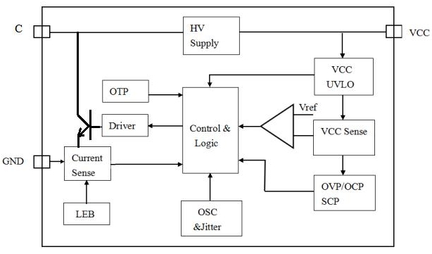 其內(nèi)部集成了650V功率開關(guān),采用專利電壓電流控制技術(shù),無需外部電壓反饋和電流偵測電路即可實現(xiàn)精確的電壓和電流調(diào)節(jié),并可實現(xiàn)兩種輸出電壓選擇,極大的方便客戶使用。