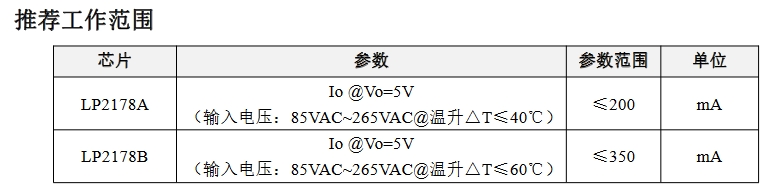 LP2178A在5V輸出電壓下,輸入電壓范圍為85VAC至265VAC,溫升△T≤40℃時(shí),輸出電流能力為≤200mA。LP2178B在相同條件下,輸出電流能力為≤400mA,是LP2178A的兩倍,適合需要更大輸出電流的應(yīng)用。