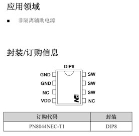 根據(jù)深圳三佛科技提供的資料,PN8044的后綴版本為"NEC-TI",這通常表示該芯片的封裝類型和可能的一些特定特性。在這個例子中,"NEC"可能代表"Non-isolated Evaluation Configuration",而"TI"可能是指"Through Hole Insertion",即通孔插入式封裝。封裝信息顯示,PN8044NEC-TI采用的是DIP8封裝。