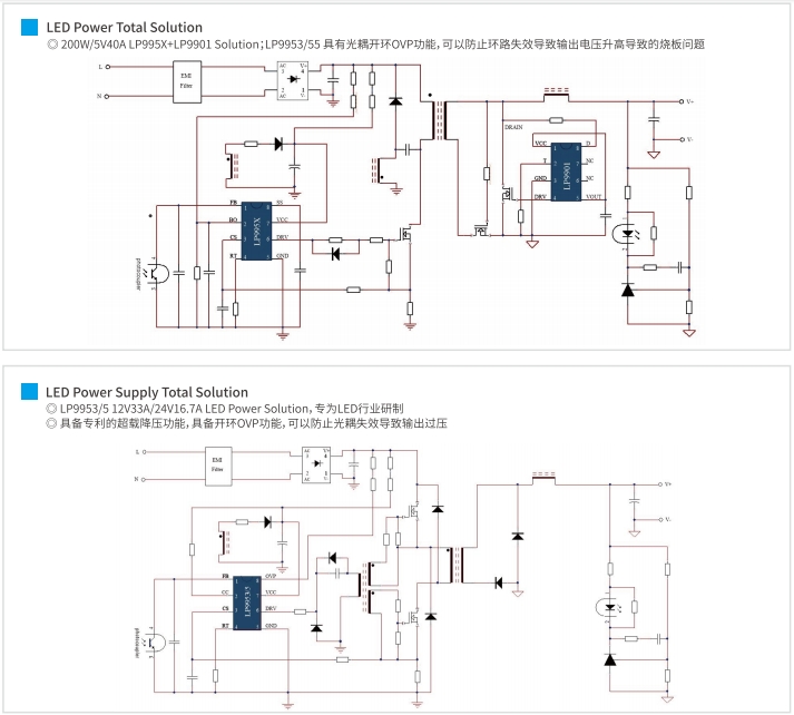 對(duì)于100~200W的LED照明系統(tǒng),推薦使用LP9952/53或LP9955/56作為PWM控制器,以及LP9901/LP9911作為SR控制器。這種配置提供了開環(huán)限壓功能,確保了高可靠性和低成本。推薦的電壓配置為5V40A,足以滿足中等功率LED燈具的需求。
