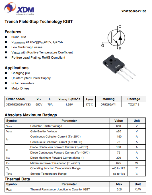 XD075Q065AY1S3 芯達茂國產IBGT +FRD單管75A 650V TO-247-3L