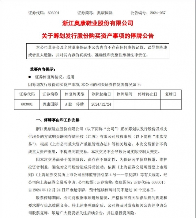 12月23日,皮鞋制造商奧康國(guó)際發(fā)布了一則令人矚目的公告,宣布公司正積極籌劃通過(guò)發(fā)行股份及或支付現(xiàn)金的方式,收購(gòu)聯(lián)和存儲(chǔ)科技(江蘇)有限公司(以下簡(jiǎn)稱(chēng)“聯(lián)和存儲(chǔ)”)的股權(quán)。這一舉措標(biāo)志著奧康國(guó)際正式跨界進(jìn)入半導(dǎo)體領(lǐng)域,開(kāi)啟了企業(yè)多元化發(fā)展的新篇章。據(jù)公告顯示,此次交易預(yù)計(jì)不構(gòu)成重大資產(chǎn)重組,也不構(gòu)成關(guān)聯(lián)交易,同時(shí)不會(huì)導(dǎo)致奧康國(guó)際實(shí)際控制人的變更。這意味著奧康國(guó)際在保持原有業(yè)務(wù)穩(wěn)定的基礎(chǔ)上,通過(guò)資本運(yùn)作的方 式,實(shí)現(xiàn)了向高科技產(chǎn)業(yè)的拓展。