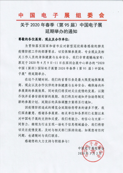 關于2020年春季第95屆中國電子展延期舉辦通知