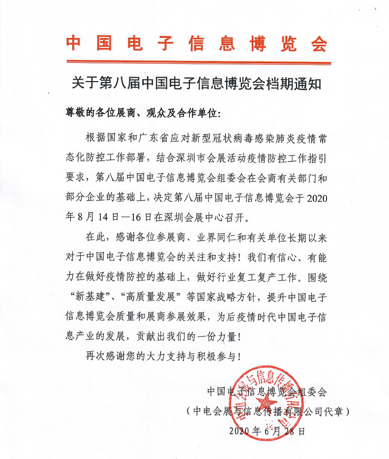 根據國家和廣東省應對新型冠狀病毒感染肺炎疫情常態化防控工作部署,結合深圳市會展活動疫情防控工作指引要求,第八屆中國電子信息博覽會組委會在會商有關部門和部分企業的基礎上,決定第八屆中國電子信息博覽會于2020年8月14日-16日在深圳會展中心召開。在此,感謝各位參展商、業界同仁和有關單位長期以來對于中國電子信息博覽會的關注和支持!我們有信心、有能力在做好疫情防控的基礎上,做好行業復工復產工作。圍繞“新基建”、“高質量發展”等國家戰略方針,提升中國電子信息博覽會質量和展商參展效果,為后疫情時代中國電子信息產業的發展,貢獻出我們的一份力量!