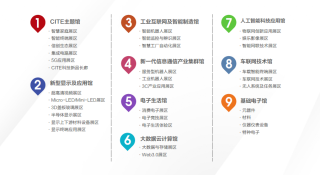 中國電子信息博覽會(CITE)通過CITE主題館、人工智能科技應用館、工業互聯網及只能制造館、新一代信息通信產業集群館、新型顯示及應用館、電子生活館、大數據云計算館、車聯網技術館及基礎電子館九大展館近25個專業展區,高效對接“政、產、學、研、用”的資源和體系,積極融入國際科技創新,全面深化推進電子信息消費科技的交流與合作,結合產業品牌優勢,通過科技創新論壇、主題報告、行業垂直專題論壇、頒獎盛典等系列活動,為業界沖分展示了智能時代電子信息產業最新發展成果和趨勢,打造國際化一流電子信息領域展示平臺。