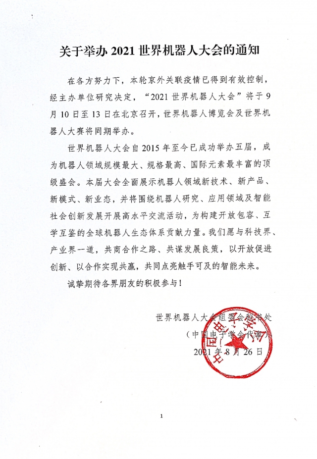 2021世界機(jī)器人大會(huì)組委會(huì)秘書處發(fā)布通知,為進(jìn)一步從嚴(yán)從緊做好首都疫情防控工作,最大程度保障所有合作伙伴、與會(huì)嘉賓和各界朋友的安全,原定2021年8月18日至22日舉辦的“2021世界機(jī)器人大會(huì)”延期舉行。日前,在本輪京外關(guān)聯(lián)疫情得到有效控制下,經(jīng)主辦單位研究決定, “2021世界機(jī)器人大會(huì)”將于9月10日至13日在北京重磅重啟,世界機(jī)器人博覽會(huì)及世界機(jī)器人大賽也將同期舉辦。目前,各項(xiàng)籌備準(zhǔn)備工作正有序推進(jìn)。