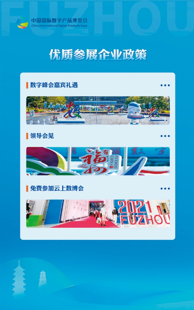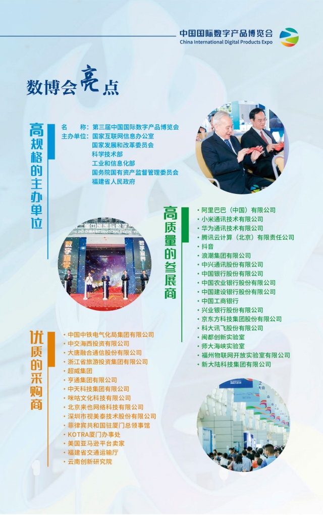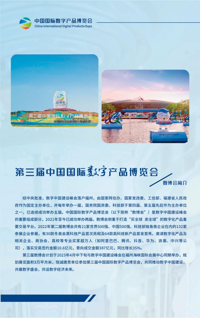 第三屆中國國際數字產品博覽會計劃于2023年4月中下旬在福州海峽國際會展中心舉辦,規劃展覽面積3萬平方米,現誠邀貴單位參加第三屆中國國際數字產品博覽會,共同推動數字中國建設,共襄數字盛會,共話數字經濟未來。