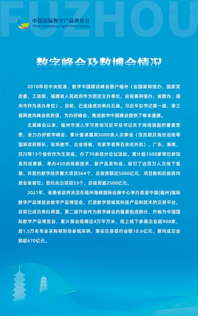 2018年經中央批準,數字中國建設峰會落戶福州(由國家網信辦、國家發改委、工信部、福建省人民政府作為固定主辦單位,由省委網信辦、省數辦,福州市作為承辦單位)。目前,已連續成功舉辦五屆。習近平總書記第一屆、第三屆兩度向峰會致賀信,為辦好峰會、推進數字中國建設提供了根本遵循。