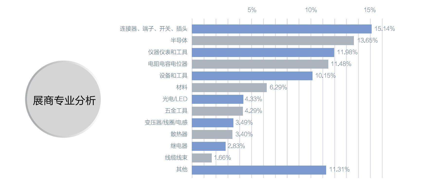 中國電子展始于1964年,自2012年,西部展永久落戶成都后,中國電子展確立了由深圳(春季展)、成都(夏季展)、上海(秋季展)輻射華南、西南和華東三大區域,基礎電子一直是中國電子展的創展基礎,主要有:電阻/電容、變壓器/電感/線圈、電聲器件、連接器/端子/接插件/開關、繼電器、線纜線束、二極管/三極管/晶體管/晶閘管、傳感器/敏感元件、印刷電路版、電源/電池、微波/射頻器件、EMC器件及系統、諧振器/振蕩器/濾波器、功率器件等,在2012年以后,中國電子展主要展品除了綜合電子元器件和儀器設備外還增加了消費類電子產品,在歷屆參展商中,半導體分立器件又占了很大比重,是中國電子展的重要展區。