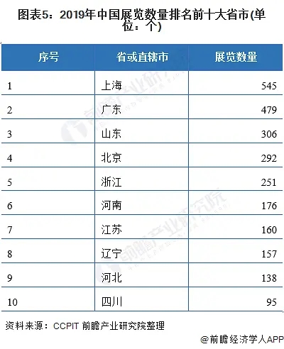 在這些一線城市,部分展覽館軟硬件都已達到了國際不平。國內中大型展覽會也都集中在這幾個地區舉辦,2019年,中國辦展數量前五省市份依次是上海、廣東、山東、北京和浙江,五大辦展強省2019年合計舉辦展覽1873個,其中上海共舉辦展覽545個,占全國展覽總數量的14.4%,;廣東省共舉辦展覽479個,占全國展覽總數量的12.6%,北京共舉辦展覽292個,占全國展覽總數量的7.7%。