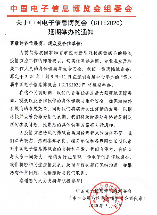 關于第八屆中國電子信息博覽會(CITE2020)延期舉辦通知