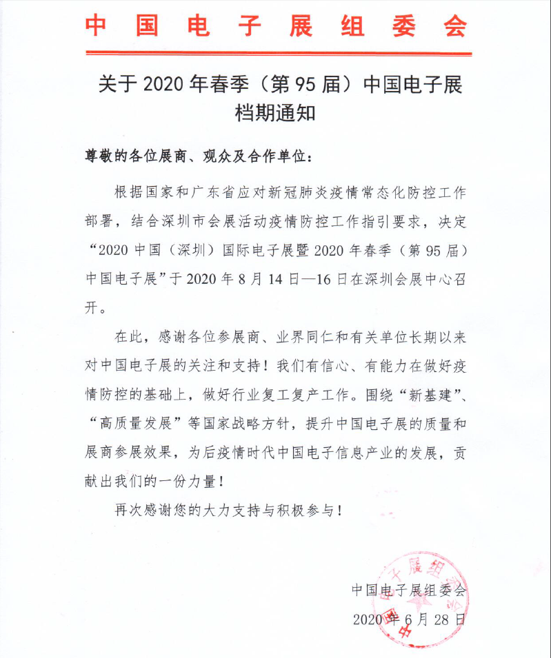 根據(jù)國家和廣東省應(yīng)對新冠肺炎疫情常態(tài)化防控工作部署,結(jié)合深圳市會(huì)展活動(dòng)疫情防控工作指引要求,決定“2020中國(深圳)國際電子展暨2020年春季(第95屆)中國電子展”于2020年8月14日一16日在深圳會(huì)展中心召開。在此,感謝各位參展商、業(yè)界同仁和有關(guān)單位長期以來對中國電子展的關(guān)注和支持!我們有信心、有能力在做好疫情防控的基礎(chǔ)上,做好行業(yè)復(fù)工復(fù)產(chǎn)工作。圍繞“新基建”、“高質(zhì)量發(fā)展”等國家戰(zhàn)略方針,提升中國電子展的質(zhì)量和展商參展效果,為后疫情時(shí)代中國電子信息產(chǎn)業(yè)的發(fā)展,貢獻(xiàn)出我們的一份力量!再次感謝您的大力支持與積極參與!